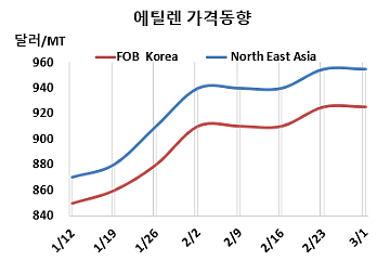 에틸렌(Ethylene)은 동남아만 상승했다. 에틸렌 시세는 3월1일 CFR NE Asia가 톤당 955달러로 변동이 없었으나, CFR SE Asia는 1010달러로 40달러 상승했다. FOB Korea는 925달러로 보합세를 형성했다. 동남아는 최근 꾸준히 강세를 보이며 2022년 9월초 1000달러를 형성한 이후 약 1년6개월만 처음으로 1000달러를 돌파했다. 표, 그래프: <Ethylene 가격동향> <화학저널 2024/03/05> |