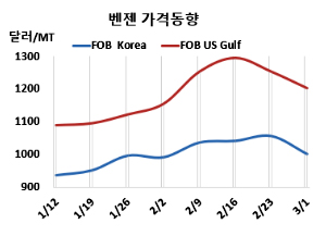벤젠(Benzene)은 폭락했다. 벤젠 시세는 3월1일 FOB Korea가 톤당 1000달러, CFR SE Asia는 980달러, CFR India는 1000달러로 각각 55달러 폭락했다. CFR China는 1015달러로 55달러, CFR Taiwan은 1020달러로 60달러 떨어졌다. 표, 그래프: <Benzene 가격동향> <화학저널 2024/03/06> |