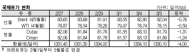 3월5일 국제유가는 중국 경제 성장에 대한 회의론이 부각되면서 하락했다.