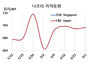 나프타(Naphtha)는 상승했다. 나프타 시세는 3월1일 C&F Japan 톤당 697달러로 2달러 상승했다. 표, 그래프: <Naphtha 가격동향> <화학저널 2024/03/08> |