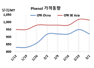 페놀(Phenol)은 하락했다. 페놀 시세는 3월1일 CFR China가 톤당 920달러로 30달러 하락했고, CFR SE Asia는 1015달러로 5달러 떨어졌다. 표, 그래프: <Phenol 가격동향> <화학저널 2024/03/08> |