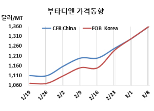 부타디엔 시세는 3월8일 FOB Korea가 톤당 1360달러로 60달러, CFR SE Asia는 1320달러로 70달러 오르며 강세를 이어갔다. 중화권도 CFR China은 1360달러로 60달러, CFR Taiwan는 1400달러로 80달러 폭등했다. 표, 그래프: <Butadiene 가격동향> |