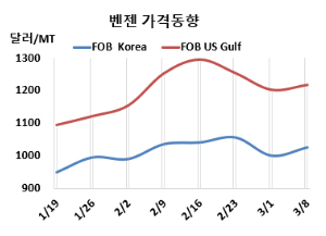 벤젠 시세는 3월8일 FOB Korea가 톤당 1025달러, CFR SE Asia는 1005달러, CFR India는 1025달러로 각각 25달러 상승했다. CFR China는 1040달러로 25달러, CFR Taiwan은 1050달러로 30달러 올랐다. 표, 그래프: <Benzene 가격동향> |