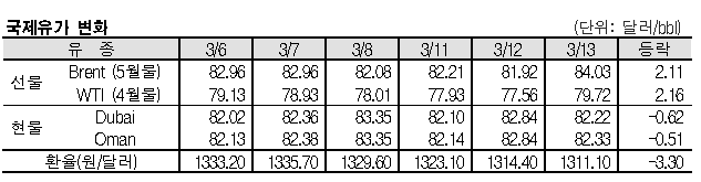 3월13일 국제유가는 미국 석유 재고 감소와 러시아 정제공장 피격으로 상승했다.