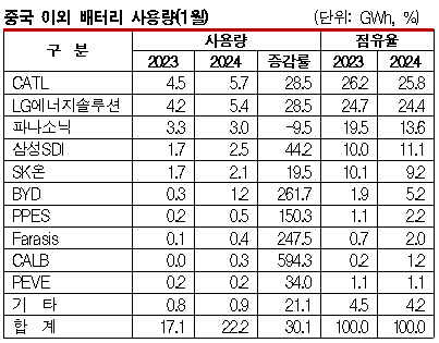 1월 시장점유율 24.4%로 2위 … 비야디, 삼성‧SK온 추격 가속화