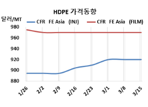 HDPE 시세는 3월13일 인젝션(Injection) 그레이드 기준 CFR FE Asia가 톤당 920달러, CFR SE Asia는 1000달러로 변동이 없었다. 블로우몰딩(Blow-Molding)도 FEA가 930달러, SEA는 995달러로 보합세를 형성했다. 필름(Film)은 FEA가 970달러로 변동이 없었으나, SEA는 1020달러로 5달러 하락했다. 얀(Yarn)도 FEA가 950달러, SEA는 1015달러로 보합세를 형성했다.