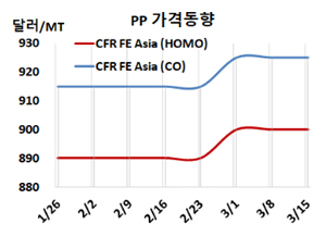 3월말/4월초 중국에 공급하는 PP 호모(Homo) 그레이드에 대해 사우디가 CFR 880-890달러를, 중동은 CFR 910-920달러를 제시했다. 동남아는 아시안이 CFR 990-1000달러를, 사우디가 CFR 960-970달러를 요구했다. 인디아에는 사우디가 CFR 990달러를, 중동이 CFR 1020달러를 제시했다.