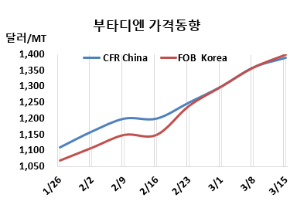 부타디엔(Butadiene)은 상승했다. 부타디엔 시세는 3월15일 FOB Korea가 톤당 1400달러, CFR SE Asia는 1360달러로 각각 40달러 오르며 강세를 이어갔다. 중화권도 CFR China은 1390달러로 30달러, CFR Taiwan는 1455달러로 55달러 상승했다. FOB Korea는 2022년 7월1일 1480달러를 형성한 20개월 만에 1400달러에 도달했다. 표, 그래프: <Butadiene 가격동향> <화학저널 2024/03/19> |