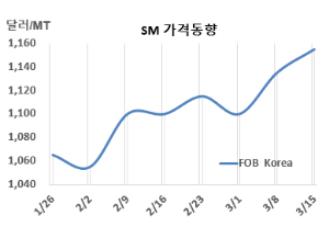 SM(Styrene Monomer)은 상승했다. SM 시세는 3월15일 FOB Korea가 톤당 1155달러, CFR SE Asia는 1205달러로 각각 20달러 상승했다. CFR China는 1165달러 20달러, CFR Taiwan은 1215달러로 30달러, CFR India는 1215달러로 20달러 올랐다. 표, 그래프: <SM 가격동향> <화학저널 2024/03/20> |