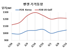 벤젠(Benzene)은 상승했다. 벤젠 시세는 3월15일 FOB Korea가 톤당 1045달러로 20달러, CFR SE Asia는 1030달러로 25달러, CFR India는 1040달러로 15달러 상승했다. CFR China는 1065달러로 25달러, CFR Taiwan은 1070달러로 20달러 올랐다. 표, 그래프: <Benzene 가격동향> <화학저널 2024/03/20> |