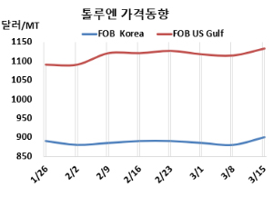 톨루엔(Toluene)은 상승했다. 톨루엔 시세는 3월15일 FOB Korea가 톤당 900달러, CFR SE Asia는 980달러로 각각 20달러 상승했다. CFR China는 905달러로 10달러, CFR India는 1010달러로 20달러 올랐다. 표, 그래프: <Toluene 가격동향> <화학저널 2024/03/20> |