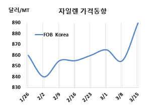 M-X(Mixed-Xylene)는 상승했다. 용제(Solvent) 그레이드 M-X 시세는 3월15일 FOB Korea가 톤당 890달러, CFR SE Asia는 980달러로 각각 35달러 상승했다. CFR China는 875달러로 변동이 없었고, CFR India는 1000달러로 35달러 올랐다. 표, 그래프: <Xylene 가격동향> <화학저널 2024/03/21> |
