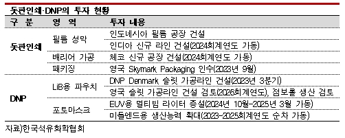 돗판인쇄와 DNP는 영업실적과 관계 없이 모두 성장사업이 순조롭게 확대되고 있는 것으로 판단하고 추가적인 투자를 준비하고 있다.