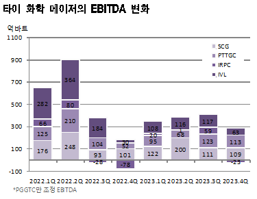 타이는 화학 메이저들의 2023년 영업실적이 크게 악화된 것으로 나타났다. 표, 그래프: <타이 화학 메이저의 EBITDA 변화> <화학저널 2024/03/25> |