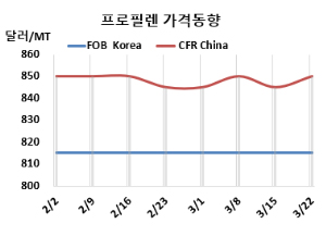 프로필렌 시세는 3월22일 FOB Korea가 톤당 815달러로 변동이 없었으나, CFR SE Asia는 845달러로 15달러 하락했다. 중화권은 CFR China가 850달러, CFR Taiwan은 860달러로 각각 5달러 상승했다.