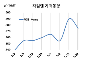 M-X(Mixed-Xylene)는 하락했다. 용제(Solvent) 그레이드 M-X 시세는 3월22일 FOB Korea가 톤당 875달러로 15달러 하락했고, CFR SE Asia는 975달러로 5달러 떨어졌다. CFR China는 855달러로 20달러, CFR India는 985달러로 15달러 하락했다. 표, 그래프: <Xylene 가격동향> <화학저널 2024/03/28> |