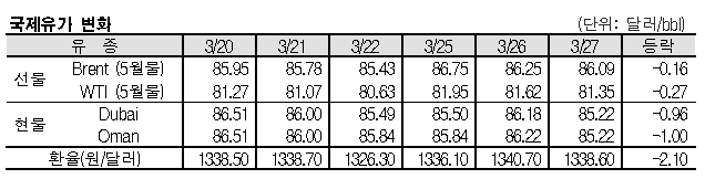 3월27일 국제유가는 미국 석유 재고 증가로 하락했다.
