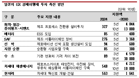 일본이 제조업 GX(그린 트랜스포메이션)에 1조3000억엔을 투입한다. 표, 그래프: <일본의 GX 경제이행채 투자 촉진 방안> <화학저널 2024년 04월 01일> |