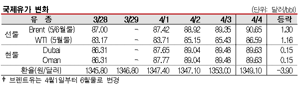 표, 그래프: <국제유가 변화> <화학저널 2024/04/05> |
