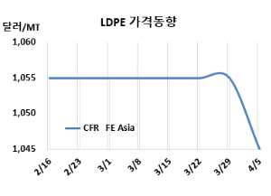 LDPE(Low-Density Polyethylene)는 하락했다. LDPE 시세는 4월3일 CFR FE Asia가 톤당 1045달러로 10달러 하락했고, CFR SE Asia는 1120달러로 변동이 없었다. CFR India도 1145달러로 보합세를 형성했다. 유럽은 4월5일 FD NWE 톤당 1255유로로 15유로 하락했다. FE Asia는 7주째 보합세를 뒤로하고 8주만에 하락했다. 표, 그래프: <LDPE 가격동향> <화학저널 2024/04/08> |