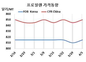 프로필렌(Propylene)은 보합세에 그쳤다. 프로필렌 시세는 4월5일 FOB Korea가 톤당 815달러로 5달러 상승했지만, CFR SE Asia는 845달러로 변동이 없었다. 중화권은 CFR China가 850달러로 5달러 올랐지만, CFR Taiwan은 860달러로 보합세에 그쳤다. 표, 그래프: <Propylene 가격동향> <화학저널 2024/04/09> |