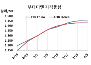 부타디엔(Butadiene)은 변동이 없었다. 부타디엔 시세는 4월5일 FOB Korea가 톤당 1430달러, CFR SE Asia는 1420달러로 변동이 없었다. 중화권도 CFR China은 1450달러, CFR Taiwan는 1510달러로 보합세에 그쳤다. 최근 상승세가 둔해지다 이번주는 변동이 없었다. 표, 그래프: <Butadiene 가격동향> <화학저널 2024/04/09> |
