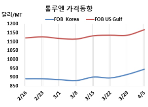 톨루엔(Toluene)은 상승했다. 톨루엔 시세는 4월5일 FOB Korea가 톤당 945달러로 30달러, CFR SE Asia는 1025달러로 35달러 상승했다. CFR China는 955달러로 30달러 올랐고, CFR India는 1065달러로 60달러 급등했다. FOB Korea는 9월29일 980달러를 형성한 이후 약 반년만에 최대치에 도달했다. 표, 그래프: <Toluene 가격동향> <화학저널 2024/04/11> |