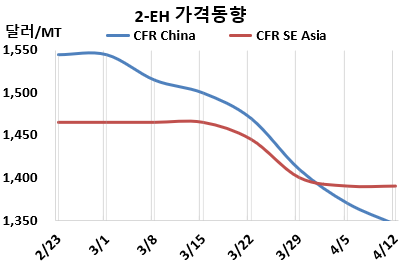 옥소알코올(Oxo-Alcohol)은 등락이 엇갈렸다. 2-EH(Ethylhexanol) 시세는 4월12일 CFR China가 톤당 1345달러로 25달러 하락했고, CFR SE Asia는 1390달러로 변동이 없었다. 표, 그래프: <2-EH 가격동향> <화학저널 2024/04/18> |