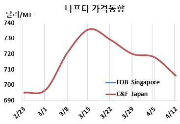 나프타(Naphtha)는 하락했다. 나프타 시세는 4월12일 C&F Japan 톤당 706달러로 12달러 하락했다. 표, 그래프: <나프타 가격동향> <화학저널 2024/04/18> |