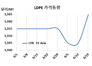 LDPE 시세는 4월17일 CFR FE Asia가 톤당 1065달러로 20달러, CFR SE Asia는 1130달러로 10달러 상승했다. CFR India는 1165달러로 20달러 올랐다. 반면, 유럽은 4월19일 FD NWE 톤당 1250유로로 10유로 하락했다.
