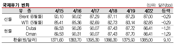 4월22일 국제유가는 중동지역의 지정학적 긴장이 완화된 영향으로 하락했다.