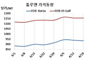 톨루엔(Toluene)은 등락이 엇갈렸다. 톨루엔 시세는 4월19일 FOB Korea가 톤당 935달러로 5달러 하락했고, CFR SE Asia도 1015달러로 5달러 떨어졌다. 반면, CFR China는 945달러로 10달러 상승했다. 표, 그래프: <Toluene 가격동향> <화학저널 2024/04/24> |