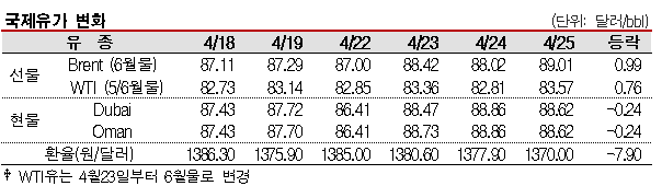 표, 그래프: <국제유가 변화> <화학저널 2024/04/26> |