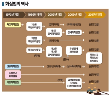 여기에 당시 화학기업들이 주력 생산한 것은 기초화학제품이고 화심법 대상은 화학기업이 거의 생산하지 않는 신규 화합물 즉 기능성 화학제품이 대부분이었다는 점도 원활한 제정 이유로 판단되고 있다.