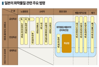 일본은 현재 노동작업에 기인한 화학물질 노출을 노동안전위생법으로, 소비자로서 직접 섭취해 발생한 화학물질 노출은 식품위생법, 의약품·의료기기 등 법(약기법)으로 관리하고 있다.