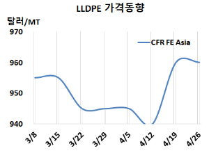 LLDPE(Linear Low-Density Polyethylene)는 인디아만 상승했다. LLDPE 시세는 4월24일 CFR FE Asia가 톤당 960달러, CFR SE Asia는 1015달러로 변동이 없었다. CFR S Asia는 965달러로 10달러 상승했다. 유럽은 4월26일 톤당 FD NWE 1150유로로 보합세에 그쳤다. 표, 그래프: <LLDPE 가격동향> <화학저널 2024/04/29> |