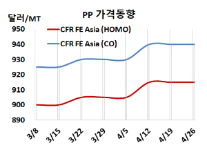 원료 프로필렌(Propylene)은 4월23일 CFR China 톤당 850달러, FOB Korea는 820달러로 변동이 없었다.