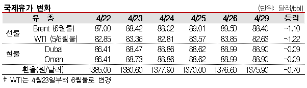 표, 그래프: <국제유가 변화> <화학저널 2024/04/30> |
