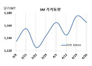 SM(Styrene Monomer)은 하락했다. SM 시세는 4월26일 FOB Korea가 톤당 1165달러로 10달러, CFR SE Asia는 1215달러로 10달러 하락했다. CFR China는 1175달러로 10달러, CFR Taiwan은 1230달러로 15달러, CFR India는 1240달러로 5달러 떨어졌다. 표, 그래프: <SM 가격동향> <화학저널 2024/05/02> |