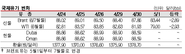 표, 그래프: <국제유가 변화> <화학저널 2024/05/02> |