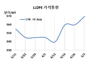 LLDPE(Linear Low-Density Polyethylene)는 상승했다. LLDPE 시세는 4월30일 CFR FE Asia가 톤당 970달러로 10달러 상승했지만, CFR SE Asia는 1015달러로 변동이 없었다. CFR S Asia는 970달러로 5달러 올랐다. 유럽은 5월3일 톤당 FD NWE 1150유로로 변동이 없었다. 표, 그래프: <LLDPE 가격동향> <화학저널 2024/05/07> |
