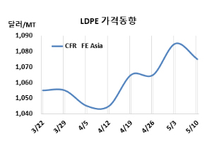LDPE(Low-Density Polyethylene)는 하락했다. LDPE 시세는 5월8일 CFR FE Asia가 톤당 1075달러로 10달러 하락했고, CFR SE Asia는 1115달러로 10달러 떨어졌다. CFR India는 1175달러로 변동이 없었다. 유럽은 5월10일 FD NWE 톤당 1190유로로 20유로 하락했다. 표, 그래프: <LDPE 가격동향> <화학저널 2024/05/13> |