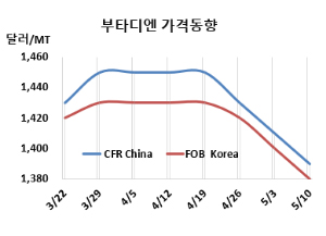 부타디엔(Butadiene)은 하락했다. 부타디엔 시세는 5월10일 FOB Korea가 톤당 1380달러로 20달러, CFR SE Asia는 1360달러로 40달러 하락했다. 중화권은 CFR China는 1390달러로 20달러, CFR Taiwan는 1400달러로 40달러 떨어졌다. 표, 그래프: <Butadiene 가격동향> <화학저널 2024/05/14> |