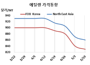 CFR NE Asia 860달러로 10달러 하락 … PE, SM, PVC 부진 지속