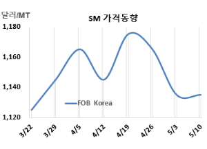 SM(Styrene Monomer)은 보합세에 그쳤다. SM 시세는 5월10일 FOB Korea가 톤당 1135달러, CFR SE Asia는 1215달러로 변동이 없었다. CFR China는 1145달러, CFR Taiwan은 1205달러로 역시 보합세를 형성했고, CFR India는 1200달러로 10달러 하락했다. 표, 그래프: <SM 가격동향> <화학저널 2024/05/16> |