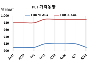 PET(Polyethylene Terephthalate)는 하락했다. 병(Bottle) 그레이드 PET 시세는 5월8일 FOB NE Asia가 910달러로 10달러 하락했고, FOB SE Asia는 990달러로 변동이 없었다. CFR S Asia도 975달러로 20달러 떨어졌다. 유럽 역시 5월10일 FD NWE가 톤당 1100유로로 10유로 하락했다. NE Asia는 3주간 변동이 없다가 4주만에 하락했다. 표, 그래프: <PET 가격동향> <화학저널 2024/05/17> |