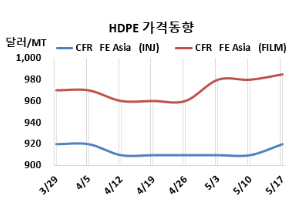 HDPE 시세는 5월15일 인젝션(Injection) 그레이드 기준 CFR FE Asia가 톤당 920달러로 10달러 상승했으나, CFR SE Asia는 1000달러로 변동이 없었다. 블로우몰딩(Blow-Molding)도 FEA가 950달러로 10달러 올랐으나, SEA는 995달러로 보합세에 그쳤다. 필름(Film)은 FEA가 985달러로 5달러 상승에 그쳤고 SEA는 1000달러로 10달러 하락했다. 얀(Yarn)은 FEA가 980달러로 10달러 올랐고, SEA는 1015달러로 변동이 없었다.