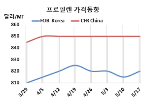 프로필렌(Propylene)은 보합세를 형성했다. 프로필렌 시세는 5월17일 FOB Korea가 톤당 820달러로 5달러 상승한 반면, CFR SE Asia는 810달러로 5달러 하락했다. 중화권은 CFR China가 850달러, CFR Taiwan도 850달러로 변동이 없었다. 표, 그래프: <Propylene 가격동향> <화학저널 2024/05/21> |