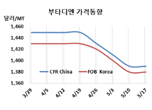 부타디엔(Butadiene)은 변동이 없었다. 부타디엔 시세는 5월17일 FOB Korea가 톤당 1380달러, CFR SE Asia는 1360달러로 변동이 없었다. 중화권도 CFR China는 1390달러, CFR Taiwan는 1400달러로 보합세에 그쳤다. 표, 그래프: <Butadiene 가격동향> <화학저널 2024/05/21> |