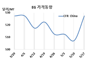 MEG(Monoethylene Glycol)는 상승했다. MEG 시세는 5월17일 CFR China가 톤당 528달러로 20달러, CFR SE Asia는 533달러로 20달러 상승했다. 표, 그래프: <EG 가격동향> <화학저널 2024/05/23> |